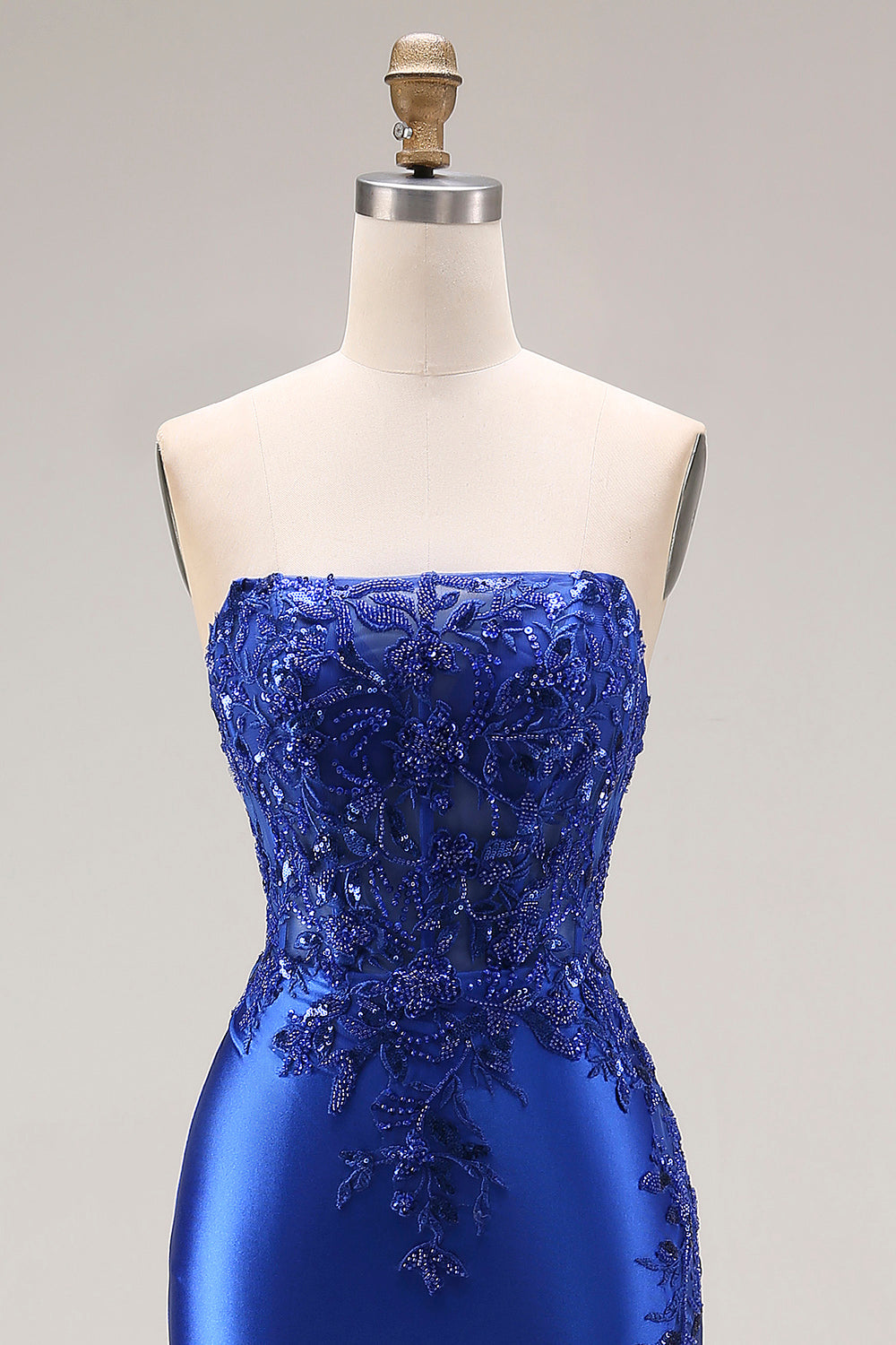 Dark Green Satin Strapless Appliqued Mermaid Long Prom Dress with Slit