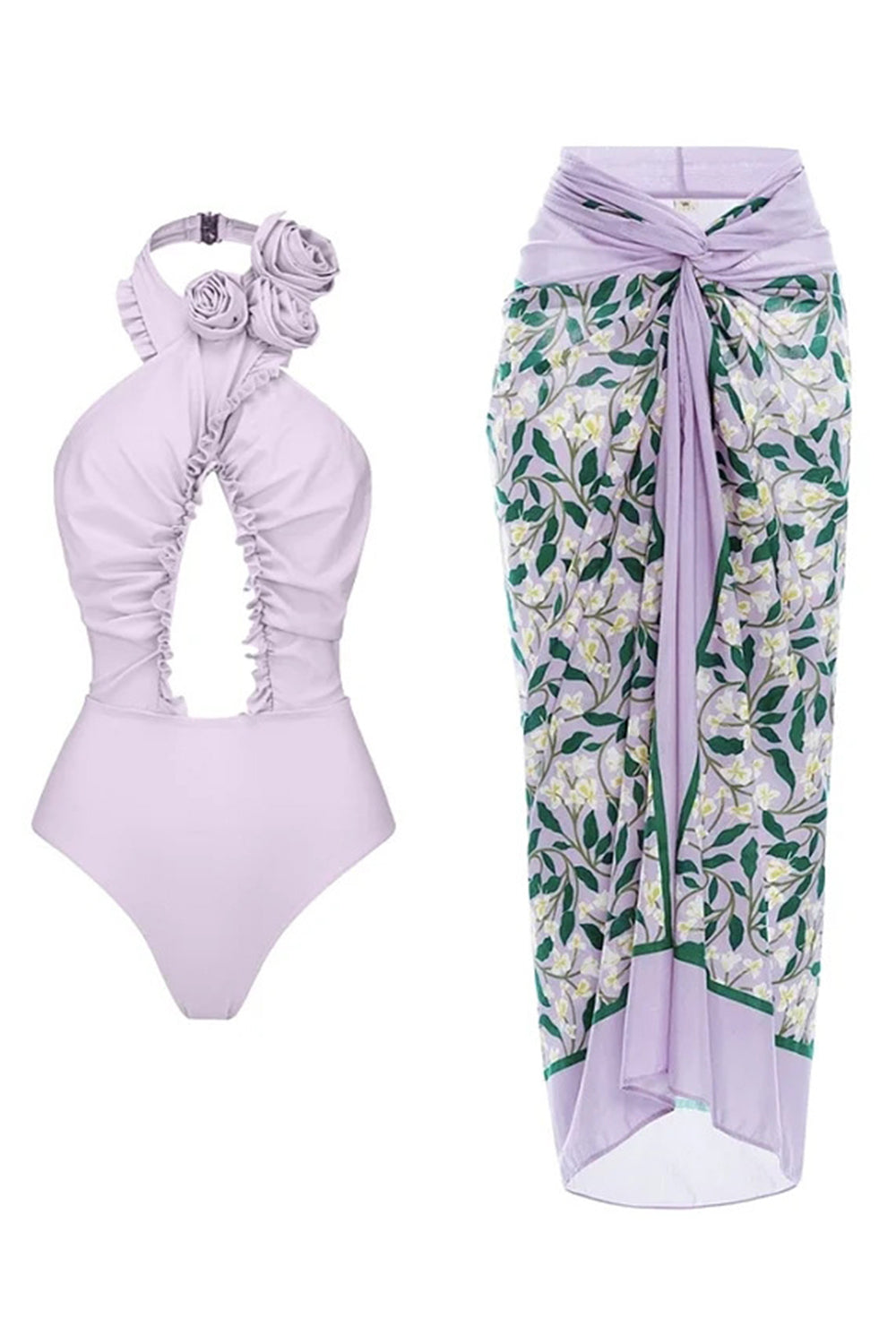 Halter 3D Flower Cut Out 2 Piece Lilac Swimsuit with Cover Up Dress