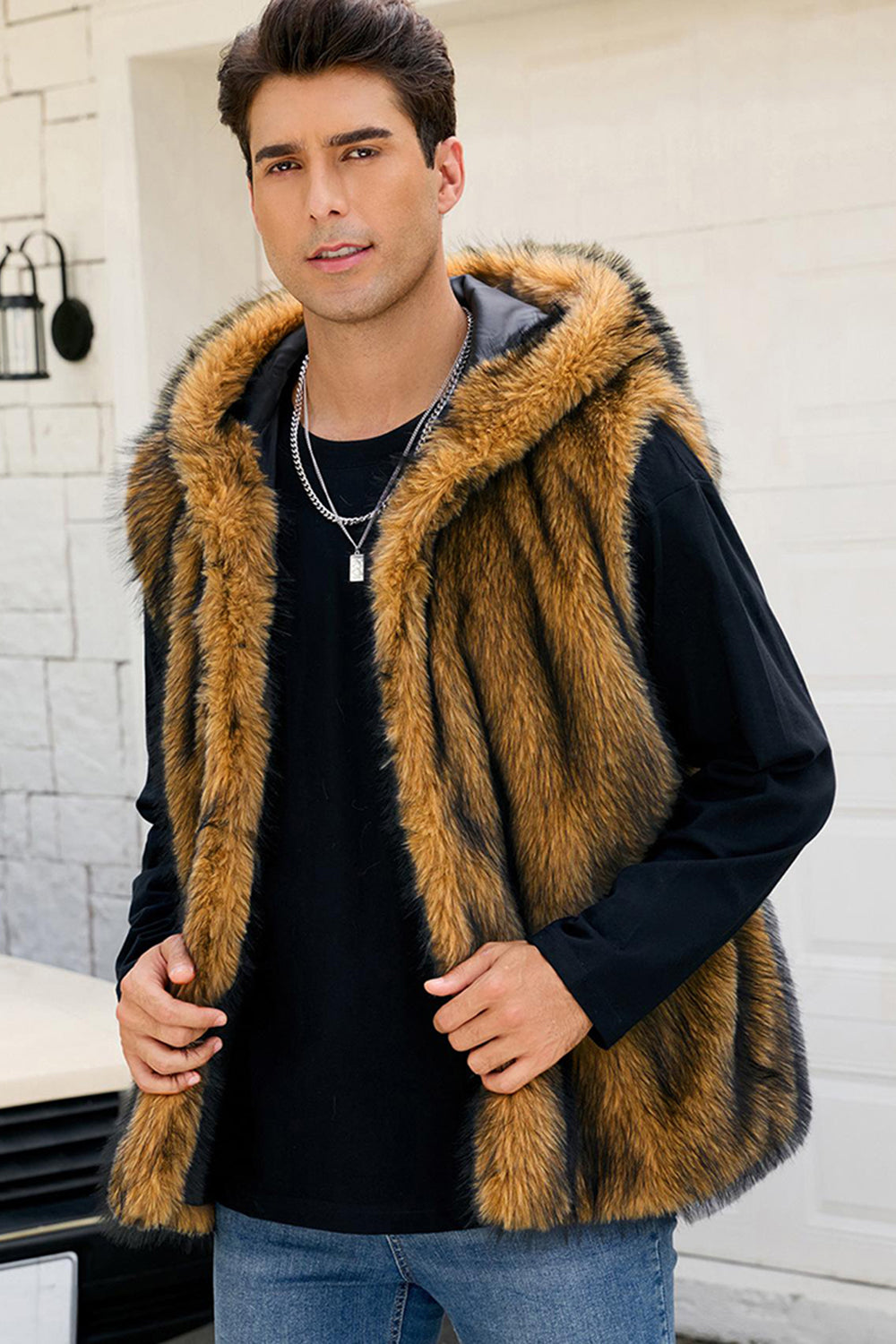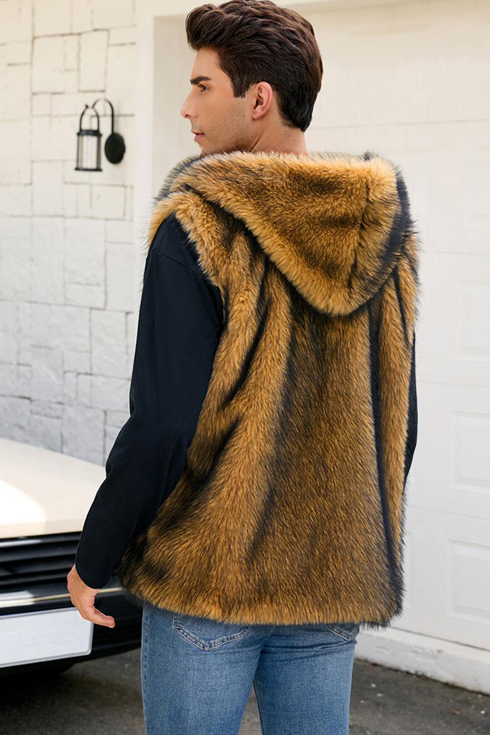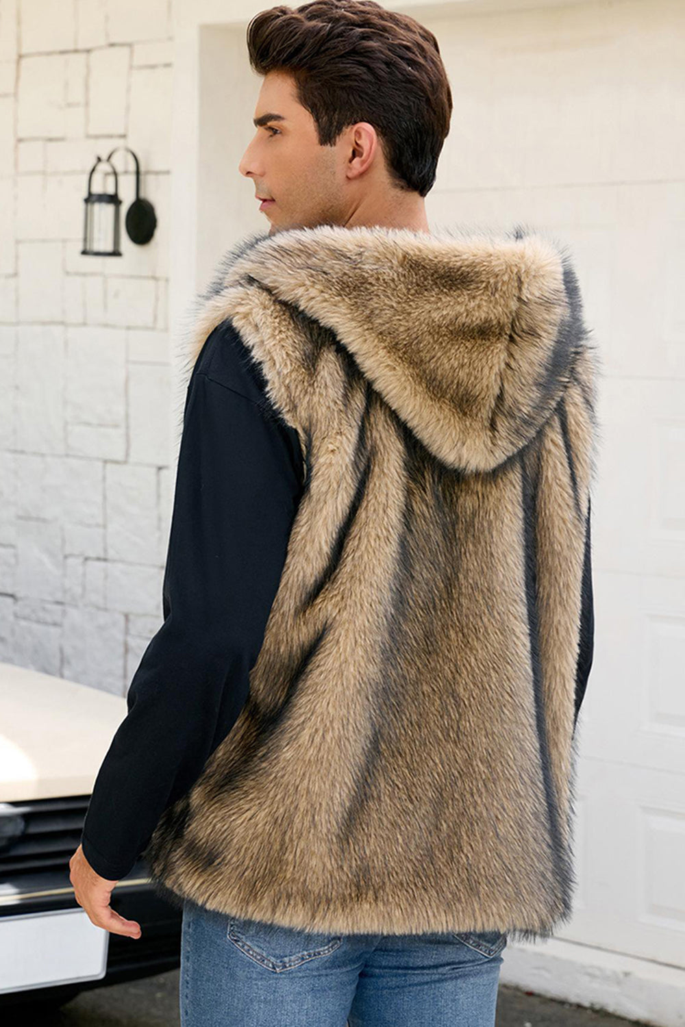 Men's Camel Faux Fur Hooded Vest