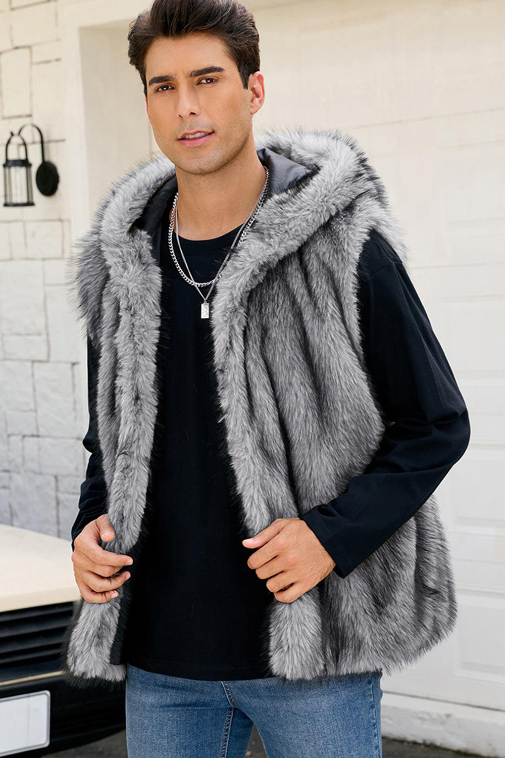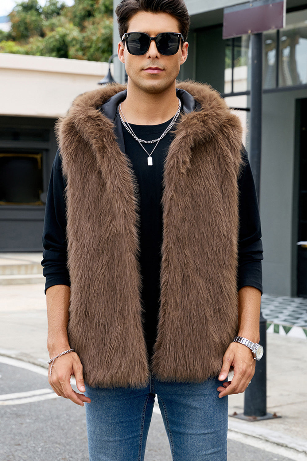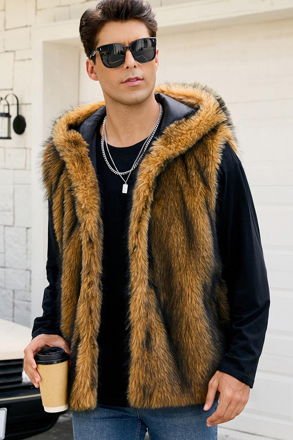 Men's Camel Faux Fur Hooded Vest