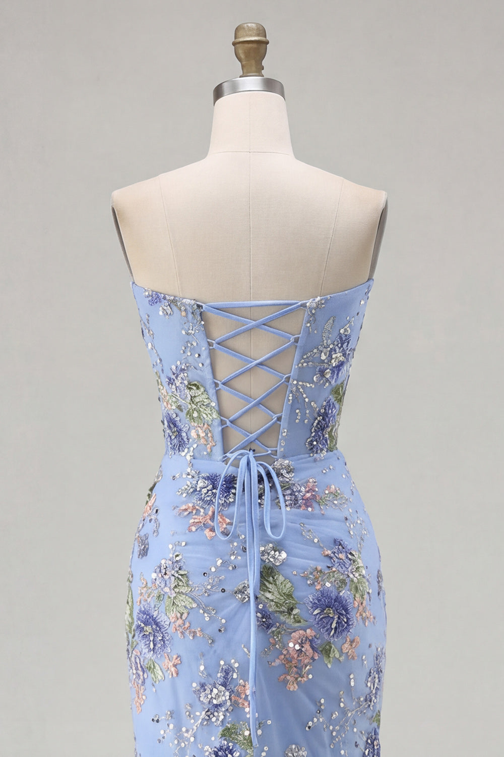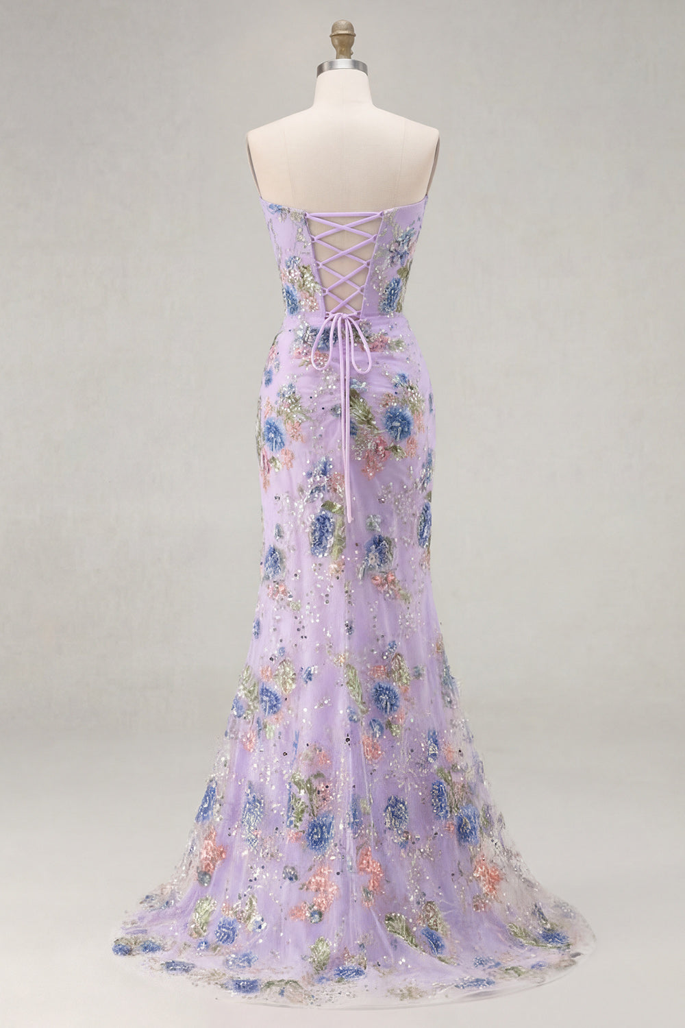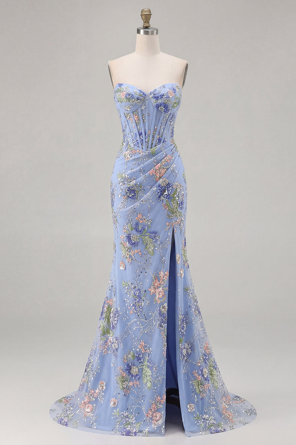 Sparkly Mermaid Strapless Corset Appliqued Sequin Pink Long Prom Dress with Slit