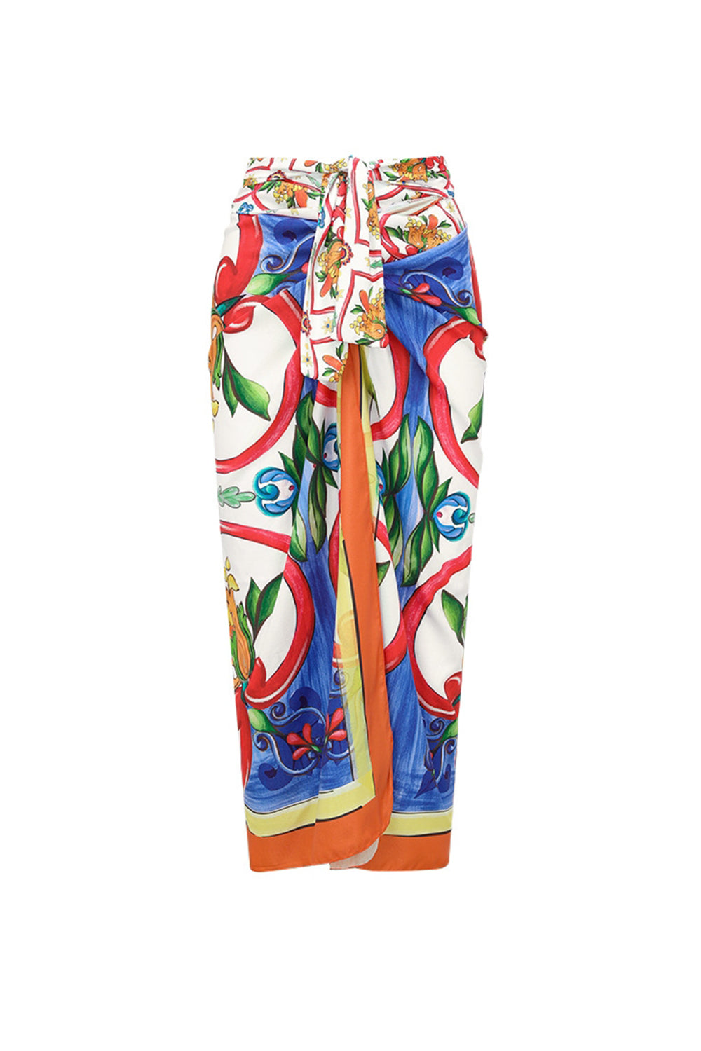 One Shoulder 2 Piece Orange Blue Print Swimwear with Cover Up Dress