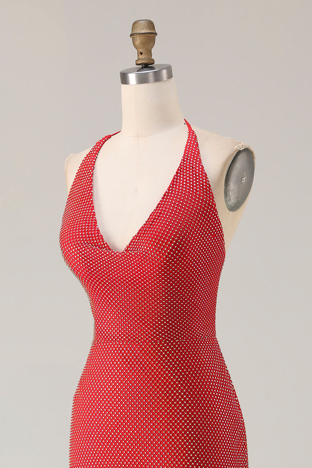 Red Halter Beaded Mermaid Long Prom Dress with Slit