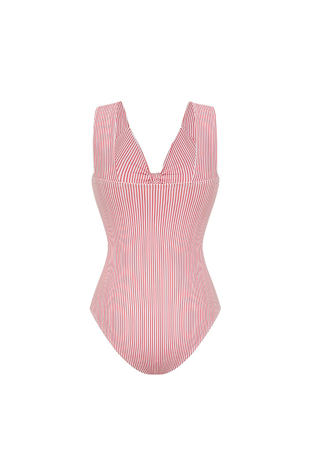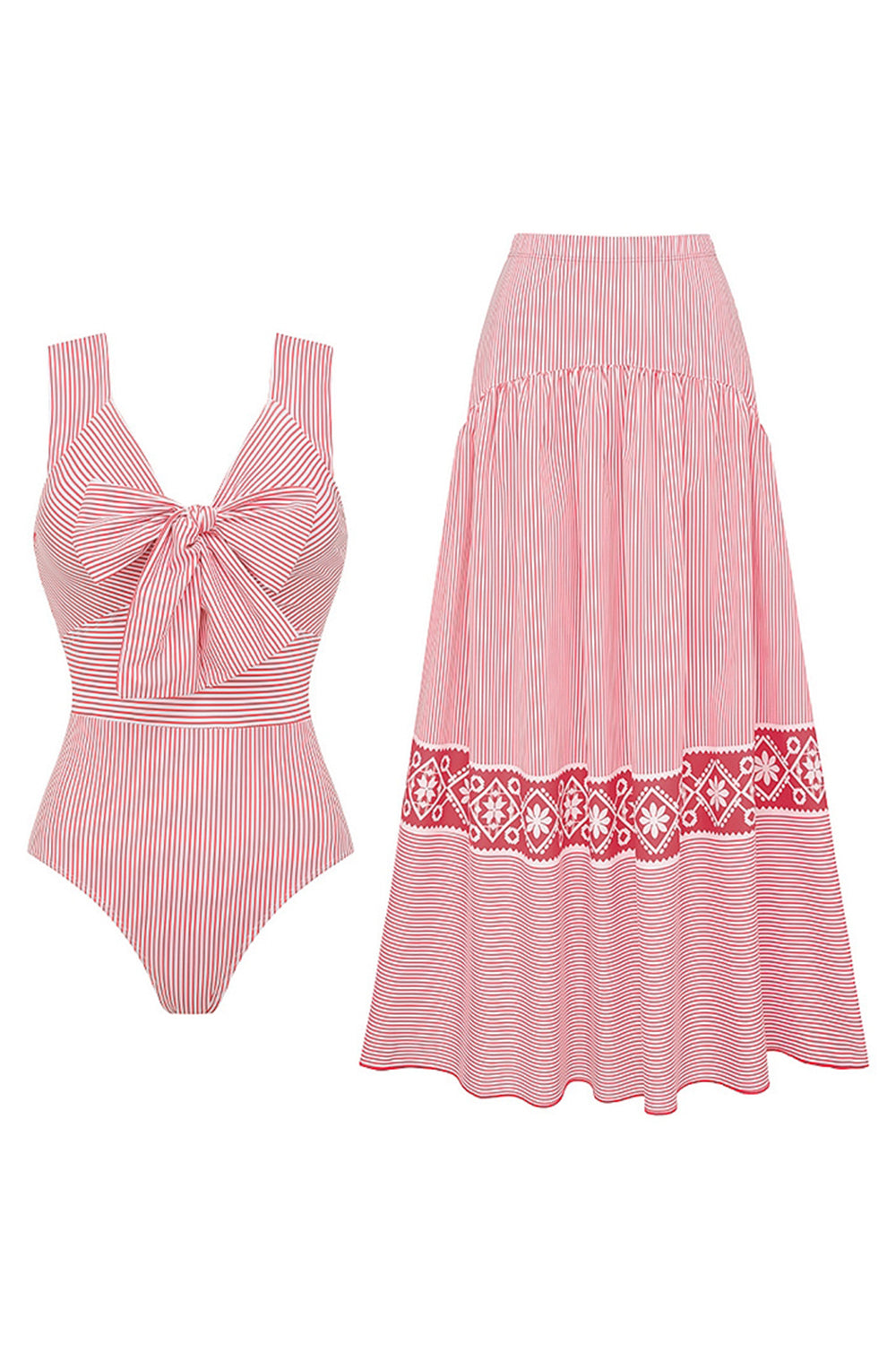 Red Striped Bowknot 2 Piece Swimwear Set with Beach Dress