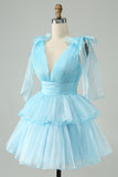 Sky Blue A Line V Neck Pleated Tiered Short Homecoming Dress