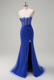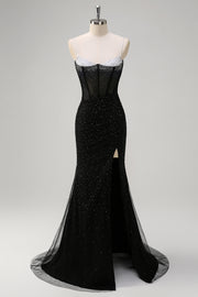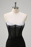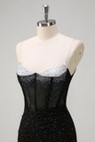 Sparkly Black Mermaid Spaghetti Straps Corset Beaded Long Prom Dress with Slit