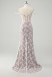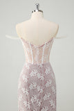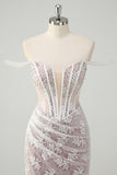 Sparkly White Mermaid Off the Shoulder Beaded Lace Corset Ruched Prom Dress with Slit