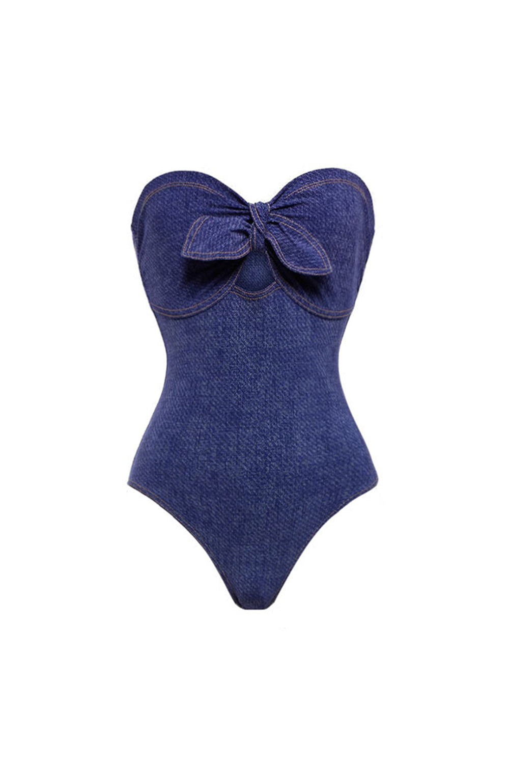 Sweetheart Navy Denim 2 Piece Swimsuit with Cover Up Skirt